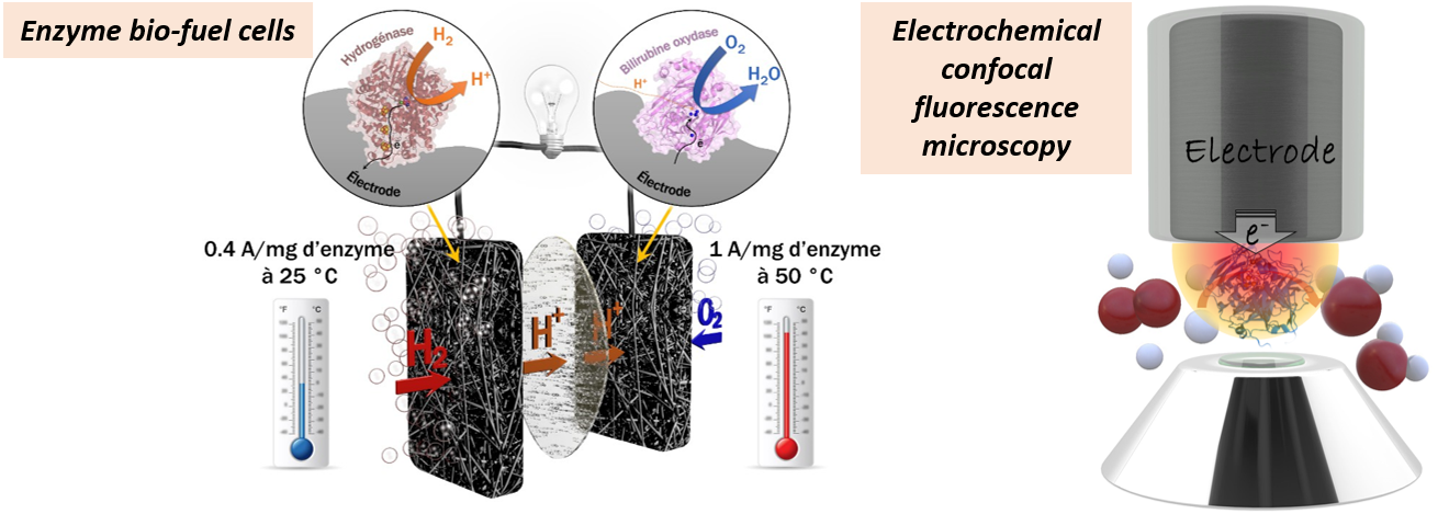 To do that, we mimic physiological electron transfer pathways by replacing the physiological partner of the protein/enzyme by an electrode. This electrode is chemically functionalized to ensure stable enzyme immobilization and favour an efficient electron transfer.