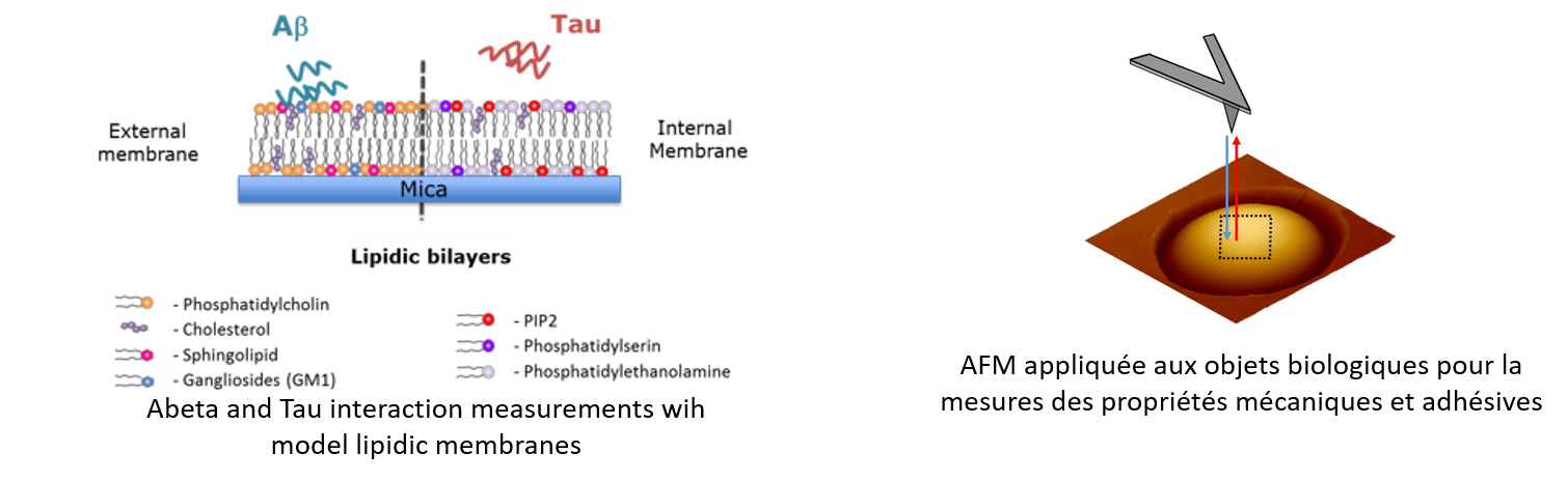 Notre activité porte notamment sur le développement des mesures nanomécaniques dans des systèmes biologiques (mesures de forces d'interaction et d'adhésion par pointes fonctionnalisées et de modules de Young apparents). Le groupe travaille également au développement d’un couplage entre AFM et microscopies de fluorescence confocale/TIRF, ainsi qu’au couplage de l’AFM et de la spectroscopie infrarouge, le NanoIR. Ces développements sont appliqués à divers systèmes biologiques, notamment à l'étude de peptides amyloïdes en interaction avec des membranes, aux propriétés mécaniques de cellules tumorales et de tissus et cellules animales, à la reconnaissance moléculaire de récepteurs spécifiques sur des membranes et à la corrélation entre propriétés mécaniques et propriétés chimiques de parois cellulaires dans les plantes et de matériaux lignocellulosiques.