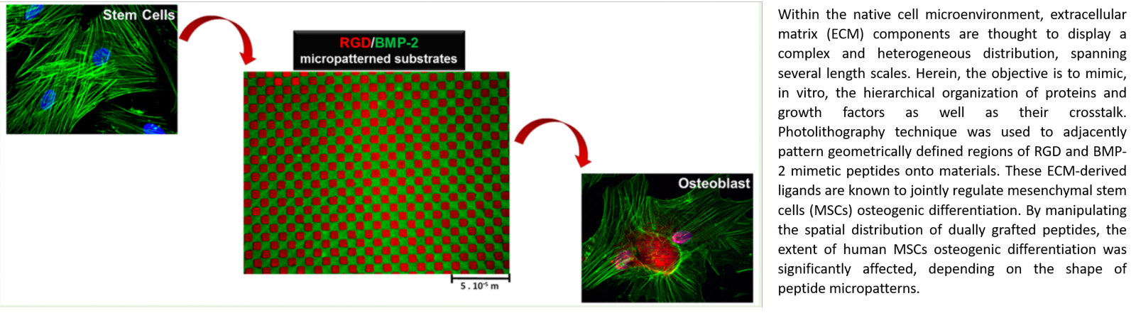 Chemical Biology and Supramolecular Chemistry (CBSC) Pole was established as a multidisciplinary structure that emphasizes chemical science at the interface of chemistry, biology and materials science. The CBSC pole conducts research involving the discovery of new small molecules, peptides, macromolecules and materials that impact molecular recognition, catalysis, biomaterials or tissue engineering, or can be used to interrogate biological processes with the ultimate goal of translating fundamental research discoveries into applications. The CBSC pole brings together synthetic organic chemists, material chemists, analytical chemists, and chemical biologists that share the same way of thinking chemistry. The activities of CBSC team are organised around themes that are all closely related to chemistry. The aim of the theme entitled « BIOdevices, BIOmaterials & BIOengineering group » is the synthesis of bioactive surfaces to favour membrane adhesion (cells, microvesicles, …) for biological engineering (biomaterials, tissue engineering, drug delivery, diagnosis, …). A special focus is made on vascular and bone tissue engineering, regeneration and repair which need original approaches of surface treatment of the materials to promote adhesion, cellular communication, and regeneration of tissues.