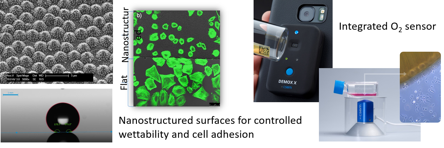 The activity focuses on material and surface sciences, nanostructuring processes, and engineering. We seek to understand the physical, chemical, and biological properties of surfaces as they relate to characteristics at the nanometer scale and to develop reliable processes for fabricating nanostructured surfaces, films, and components with enhanced performance or unique properties. CSEM contributes to novel solutions in many different areas: nanoscale security features, ultra-thin membranes for sensing and separation, gas- and chemical-sensing based on sol-gel and molecular imprinted polymer films. We also work on smart surfaces with tailored cell adsorption or antibacterial properties, on smart coatings with optimized wetting, and tribological properties. Several printing technologies complete our technological platform for the local patterning of surface functionalities.