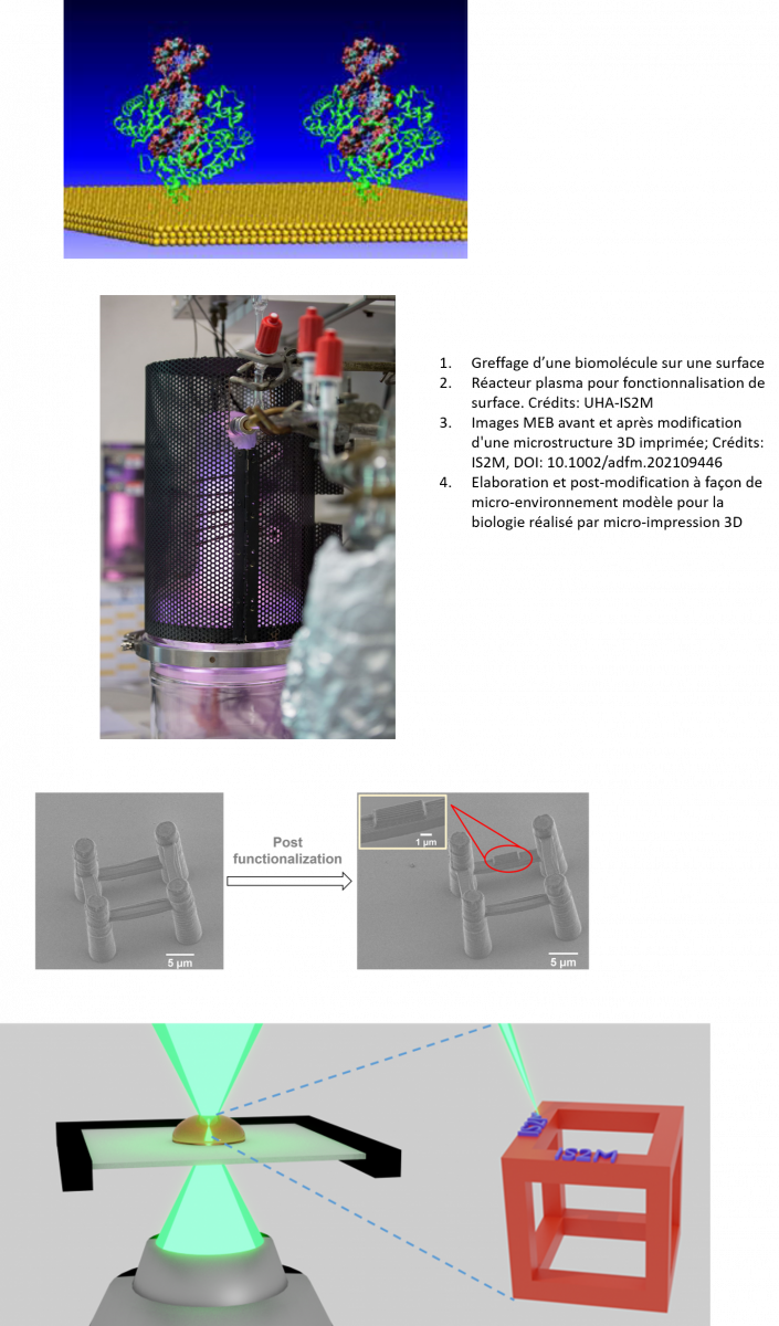 Le développement de dispositifs ou biomatériaux innovants en particulier pour des applications biologiques dans des domaines tels que le biomédical, la biodétection ou le biofouling nécessite un contrôle précis des interactions entre les objets biologiques, que sont les biomolécules, les cellules ou les microorganismes par exemple, et la surface du matériau. Le développement d’une interface complexe débute généralement par la définition de la fonctionnalité chimique que la surface doit présenter. Cette fonctionnalité est conférée à la surface via différents protocoles incluant la fonctionnalisation chimique, l’impression 3D et/ou nano-structuration. Qu’elle s’effectue par voie sèche ou humide, sur substrats homogènes, ou hétérogènes, l’enjeu principal de cette étape de fonctionnalisation est de contrôler la densité de greffage, la localisation des fonctions réactives ainsi que leur accessibilité. Outre le contrôle des propriétés chimiques de la surface, la maîtrise des caractéristiques physiques de cette dernière constitue un enjeu majeur dans la bioingénierie des interfaces. A titre d’exemples, les propriétés viscoélastiques, la dureté ou encore la déformabilité de la surface sont autant de caractéristiques ayant un impact direct sur le comportement d’un objet biologique au contact d’un matériau.