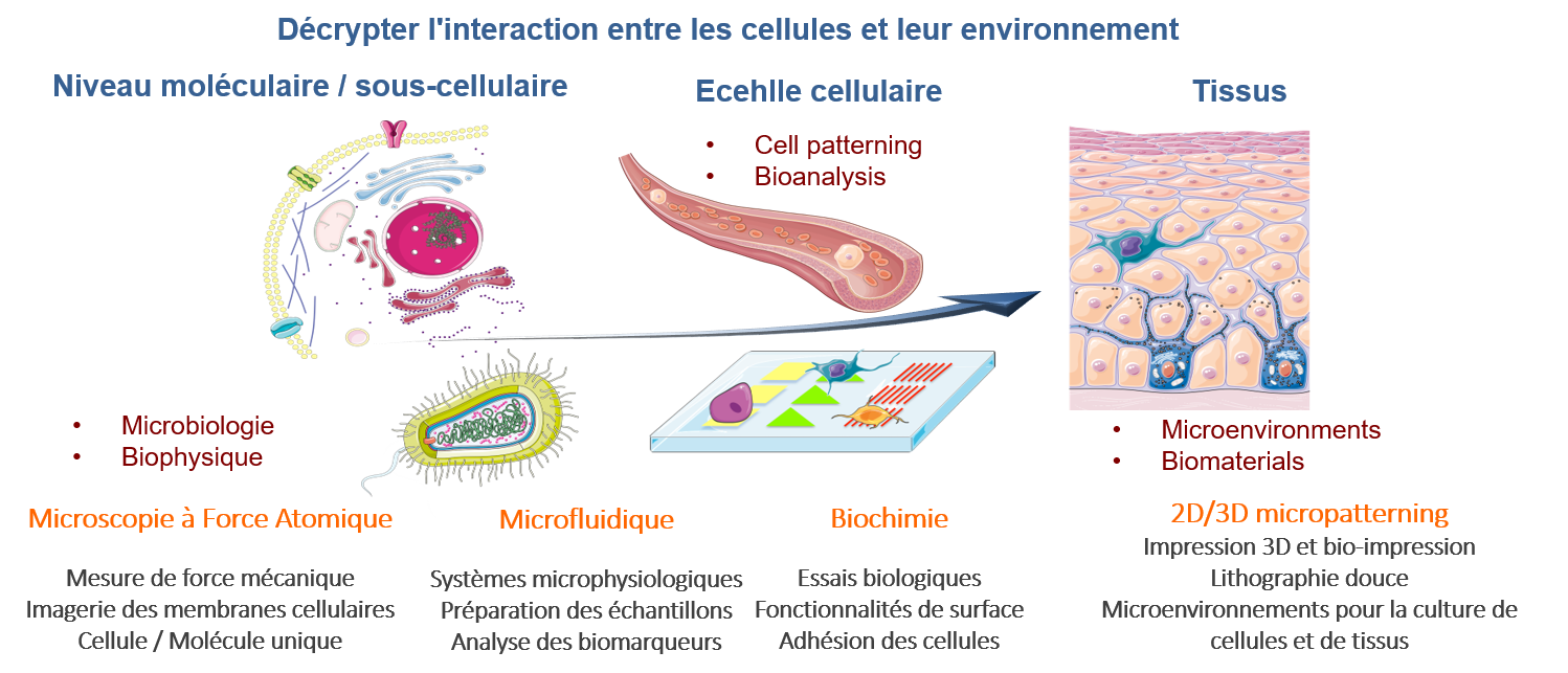 L’équipe ELiA a pour objectif le développement de projets de recherche interdisciplinaires à l’interface entre les Micro et Nanotechnologies, la biologie, la biophysique et les applications médicales. L’équipe ELiA développe des technologies innovantes pour l'étude des bio-interfaces, l'organisation de biomolécules et de cellules pour la réalisation d'architectures 2D et 3D et le développement de dispositifs d'analyse. Les champs d’applications couvrent l’étude des mécanismes subcellulaires, le développement de microdispositifs pour la détection et l’analyse de biomarqueurs circulants, ainsi que la fabrication de microenvironnements cellulaires et de modèles tissulaires.