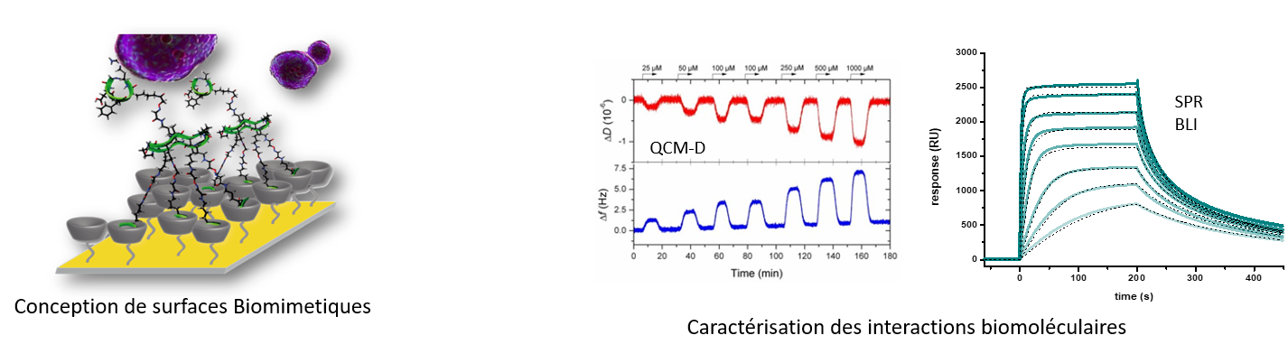 Les recherches de l'I2BM se concentrent sur la chimie des biomolécules (acides nucléiques, sucres, peptides, protéines) pour créer des macromolécules multifonctionnelles. Leurs propriétés sont analysées grâce à des études physico-chimiques (QCM-D, SPR, ellipsométrie, BLI, AFM...), ainsi qu'à des approches de biologie moléculaire et cellulaire. Nos projets, allant de la recherche fondamentale à des applications concrètes, se situent à l'interface entre la chimie et la biologie. Nous travaillons notamment sur la conception d'architectures supramoléculaires synthétiques et d'interfaces fonctionnelles pour la bioanalyse, le diagnostic et des applications thérapeutiques (cancer, neuropathies, maladies bactériennes et virales)..