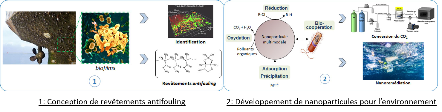 Les projets interdisciplinaires du LBBM se situent à l'interface entre la microbiologie, l'écologie et la chimie. Ceux-ci visent notamment 1) à comprendre le développement des biofilms (association complexe de microorganismes), structures essentielles au fonctionnement des écosystèmes et des organismes, 2) à concevoir des revêtements antifouling innovants et écoresponsables afin de bloquer leur croissance sur divers matériaux et 3) développer des photocatalyseurs (nano et bulk) basés sur des semi-conducteurs pour la remédiation environnementale et la conversion du CO2. De plus, l’équipe à projet Biocapteurs-Analyses – Environnement apporte un expertise complémentaire afin de concevoir des biocapteurs pour l’environnement et l’agro-alimentaire.