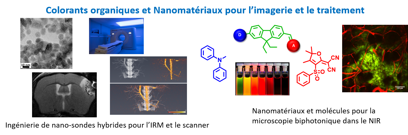 Plus particulièrement nos travaux sont orientés vers la synthèse de systèmes moléculaires ayant des propriétés optiques spécifiques (linéaires ou non linéaire), la préparation de nanomatériaux par chimie des colloïdes et chimie douce (sol-gel) et la conception de structures plasmoniques (nanoparticules métalliques). La maitrise de l’association de ces technologies permet ainsi le design d’agents/sondes innovants pour des applications dans le domaine des biotechnologies, du diagnostique et du traitement.