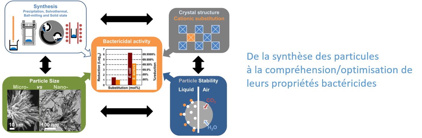 Au sein de la thématique "Matériaux Inorganiques" de l’IMMM, le groupe de Gwenaël Corbel conçoit et étudie des matériaux à base de cuivre capables de tuer les bactéries responsables des infections nosocomiales ou d'origine alimentaire. Le cœur de métier de ce groupe porte sur la synthèse et la caractérisation de particules de taille micrométrique ou nanométrique. Des voies de synthèse simples, rapides et respectueuses de l'environnement sont privilégiées, tant que la composition chimique du matériau et son activité bactéricide puissent être contrôlées. Ces particules sont caractérisées par diffraction, microscopie électronique et diverses spectroscopies afin de déterminer leur structure cristalline, leur composition ou la modification chimique opérée, leur morphologie et leur taille. Le mécanisme à l’origine de l’activité mesurée est recherché en étudiant la réactivité des particules avec leur environnement (eau/air).