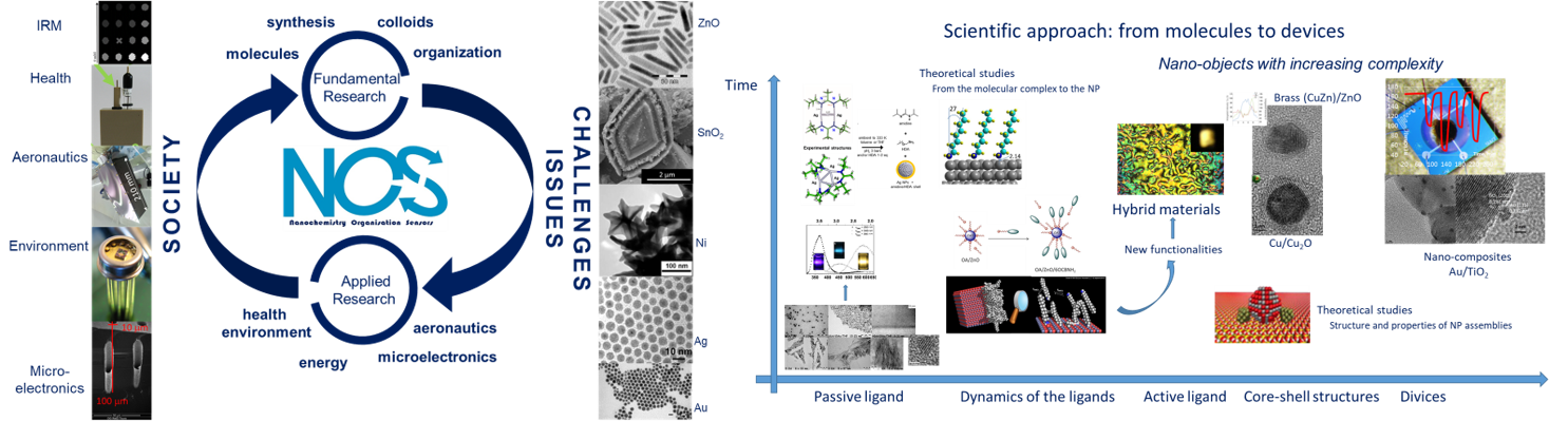Les recherches menées au sein de l’équipe "Nanochimie, Organisation et Capteurs" du LCC concerne les nanosciences et ses applications en relation avec les grands défis sociétaux tels que l’aéronautique, l’énergie, l’environnement, la micro-électronique, la santé. L’activité de recherche de l’équipe NOS est centrée sur la conception et l’élaboration de nano-objets et de nanomatériaux complexes de types hybrides : de la synthèse du précurseur métal-organique au(x) dispositif(s). L’idée est de développer une véritable stratégie qui permet d’aboutir à des nano-systèmes parfaitement maitrisés multifonctionnels dans le but de développer des réponses innovantes à des enjeux sociétaux. L’équipe NOS s’appuie également sur un fort réseau de collaborations locales, nationales et internationales.